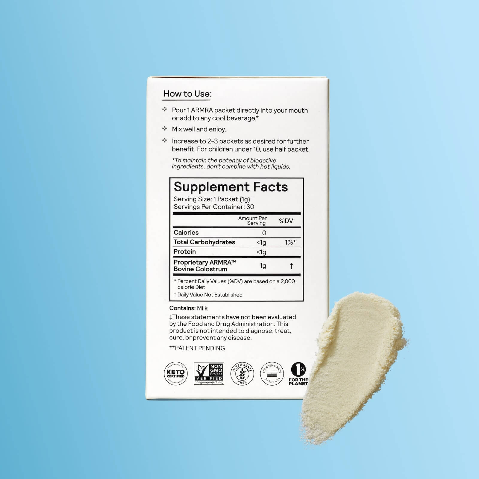 ARMRA Colostrum™ is the premium bovine colostrum concentrate teeming with 400+ bioactive nutrients that strengthen immunity, fuel natural energy fortify gut health, and more.